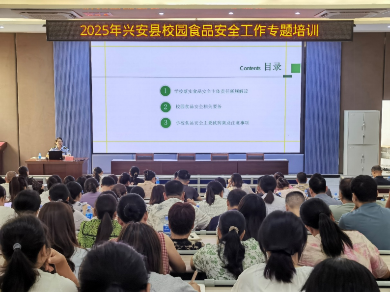 8月26日上午,广西壮族自治区桂林市兴安县市场监管局正在兴安中学逸夫楼会议室组织召开全县学校(含长儿园)食物平安专题培训会。全县各级各类学校、长儿园的担任人、食物平安总监、食物平安员共计260余人加入培训。